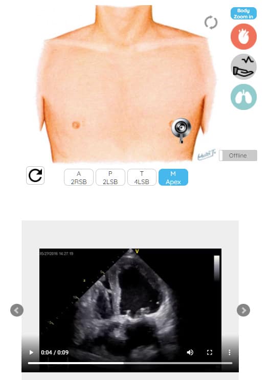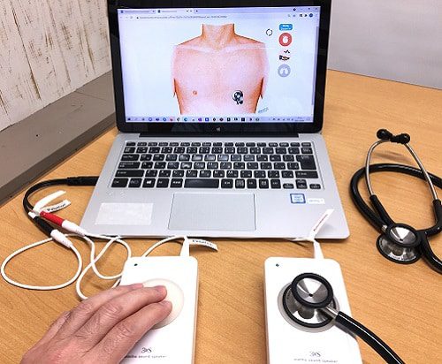 Yes, students connect the Kikuzo speaker to their PC or smartphone. They go to the website and they see the image of a human torso. They can move the chest piece icon on different parts of the torso and listen, with the Kikuzo speaker and their stethoscope, to the real sounds associated with the area or with some pathologies affecting this particular area. For example, aortic stenosis or mitral regurgitation.