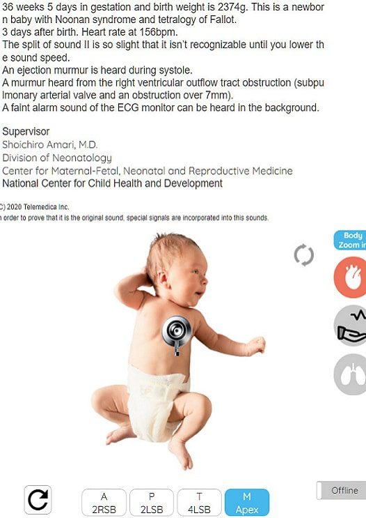 Recently, we added many case studies, neonatal auscultation content and spectrum analysis videos to our system. You can see in the pictures that the blood pressure is measured in two ways, auscultation and palpation. Teachers evaluate that having two students perform the measurement in the two different ways will stimulate practical training and increase the educational effect.