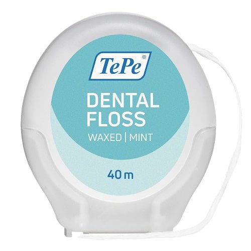 TePe's products include dental floss made from recycled water bottles—with a container and outer packaging made from recycled materials—and a toothbrush with a reusable handle. (Credit: TePe)