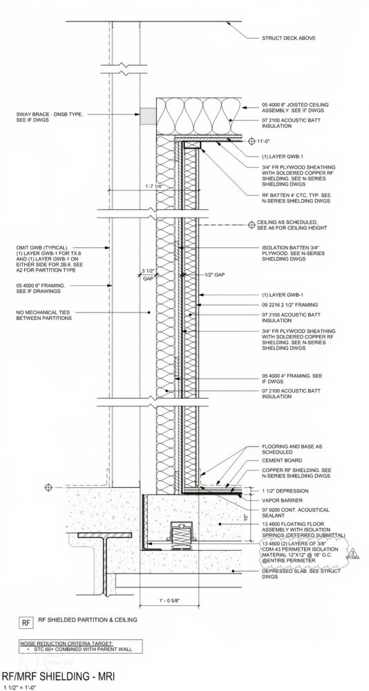 This is essentially building a structurally isolated and shielded room within a room. The elevated platform is suspended by springs above the building slab while sway braces provide a buffer between the building walls and the MRI’s self-supported framed walls. Lining the room’s substructure are layers of copper RF shielding and steel magnetic shielding. This configuration works in both directions: the springs minimize the transfer of the MRI’s vibration to surrounding spaces while they also protect the MRI’s images from building external vibrational forces. Advantageously, it also improves sound mitigation.